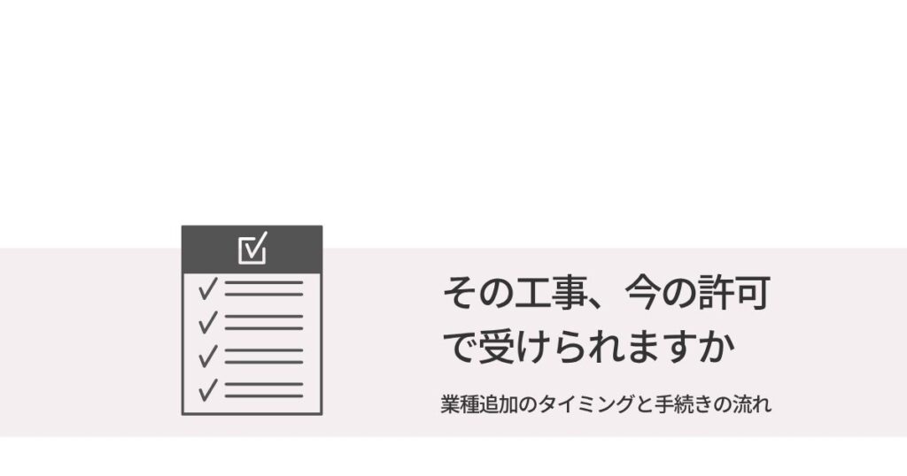 建設業許可を取得した後、「この工事もうちで受けられないか」と考える場面が出てくることがあります。 新しい取引先からの依頼、自社の得意分野の広がり、経営の方向性の変化。きっかけは様々ですが、許可を受けた業種以外の工事を請け負うには、業種追加...