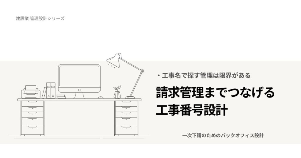 「この請求、入金済みでしたか?」「これ、前にも請求していませんでしたか?」 請求書まわりで一度でも不安になったことがあるなら、それは整理不足ではなく、設計の問題です。 多くの会社が工事名で管理しています。 しかし、工事名だけではは“キー”とし... -