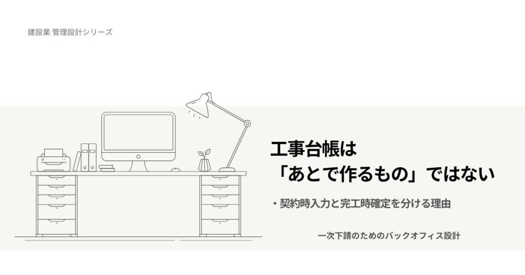 ― 契約時入力と完工時確定を分ける理由 ― 本記事でいう「工事台帳」は、各現場ごとの原価台帳ではなく、全工事を一覧で管理する“工事情報マスター”を指します。 決算前になると、完成工事高の集計に追われる。 経審の準備で、直前3年の数字を拾い直す。 元... -